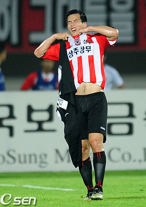 후반 상주 권순태 골키퍼가 퇴장을 당하자 미드필더 곽철호가 골키퍼로 교체되며 유니폼을 갈아입고 있다. 상주는 승부조작 관련 소환 조사로 교체 골키퍼가 없는 상황이다. /jpnews@osen.co.kr