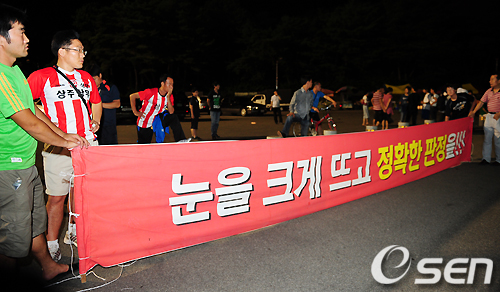 경기후 상주 서포터즈가 골키퍼 권순태 퇴장과 관련해 고금복 주심을 만나게 해달라며 항의를 하고 있다. /jpnews@osen.co.kr