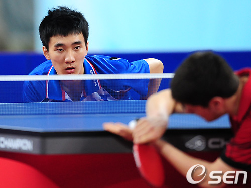 남자단식 결승전 경기에서 대한민국 이상수가 독일 드미트리의 서브를 바라보고 있다. / sunday@osen.co.kr