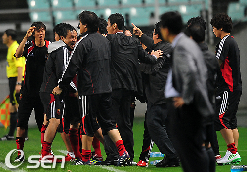후반 서울 데얀의 골로 2대2 동점이 되자 최용수 감독대행을 비롯한 코칭스태프가 기뻐하고 있다. /jpnews@osen.co.kr