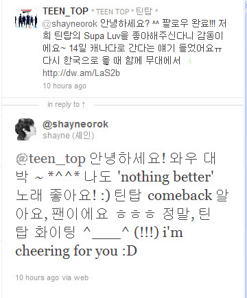 이에 틴탑은 트위터를 팔로우한 셰인에게 “팔로우 완료! 저희 틴탑의 ‘Supa Luv’를 좋아해주신다니 감동이다. 14일 캐나다로 간다는 얘기 들었다. 다시 한국으로 올 때 함께 무대에서 ‘Nothing Better’ 부르고 싶다. 멋진 모습으로 컴백할 테니 지켜봐 달라”며 감사인사를 전했다.
