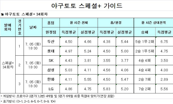 이번 야구토토 스페셜+ 34회차 게임은 5일 오후 6시 20분에 발매가 마감된다.