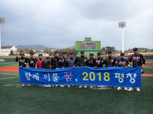 <사진 위>2009년 제주도 생활체육 야구대회에 출전한 쉬리 야구단 선수들이 2018 평창 동계올림픽 유치 염원을 내건 플래카드를 펼쳐보이고 있다.