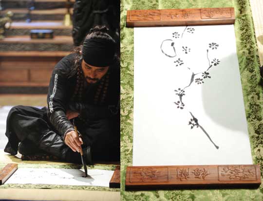 알고 보니 그는 촬영용으로 준비된 매화나 난이 그려진 그림에다 붓으로 터치를 하면서 그림을 완성하고 있는데 이미 데생을 비롯해 유화, 크로키 등에도 수준급의 그림실력을 가진 터라 그의 실력에 보는 이들도 감탄을 금치 못했다는 후문이다.