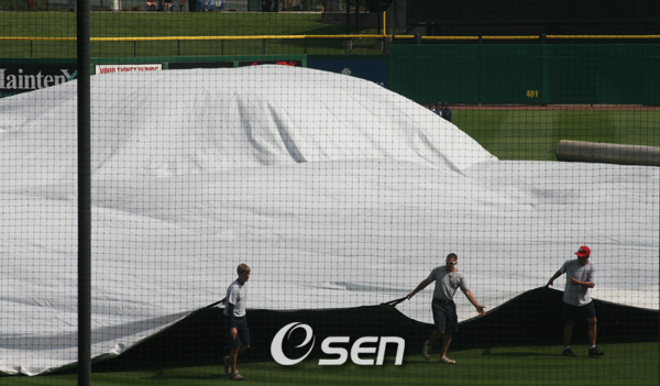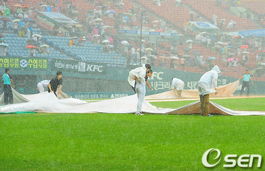 그렇다면 방수포 관련 구단에서 보완하고 있을까요. 한국의 경우 방수가 되는 방수포를 갖고 있는 구장은 SK 와이번스 홈구장인 문학구장, 그리고 LG와 두산이 함께 쓰는 잠실구장도 있습니다.