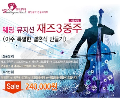 웨딩뮤지션은 이번에 결혼대백과 웨프에서 재즈 3중주 공동구매 이벤트를 진행 중이다. 재즈 피아노, 색소폰(재즈 플룻), 재즈드럼(콘트라베이스)의 하모니가 어우러져 특별한 결혼식을 연출해 줄 것이며, 이번 웨딩뮤지션의 공구에 참여한 모든 신랑 신부에게 e-청첩장을 제작해주는 혜택이 제공된다.