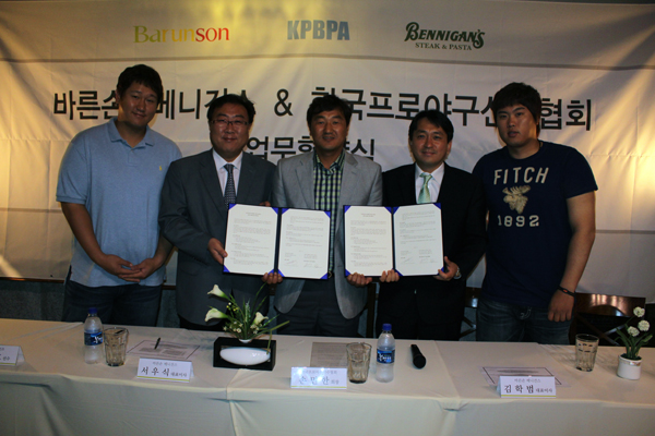 한국프로야구선수협회(회장 손민한, 이하 선수협회)와 ㈜바른손·베니건스(대표 서우식, 김학범, 이하 바른손)는 지난 4일 오전 11시 삼성동에 소재한 베니건스 테헤란점에서 전략적 사업 제휴를 위한 양해각서(MOU) 체결식을 갖고, 양측이 보유한 리소스를 활용하여 각종 제휴 사업을 추진하기로 합의했다.
