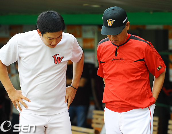 5일 오후 인천 문학구장에서 열리는 '2011 롯데카드 프로야구' SK 와이번스와 삼성 라이온즈의 경기전 SK 김성근 감독이 송은범과 이야기를 하고 있다. 김성근은 몇일전 인터뷰에서 SK 마운드의 키는 송은범이라며 믿음을 확인한 바있다. / soul1014@osen.co.kr