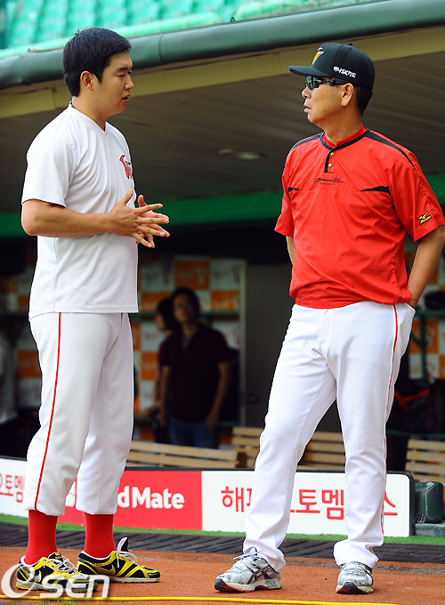 5일 오후 인천 문학구장에서 열리는 '2011 롯데카드 프로야구' SK 와이번스와 삼성 라이온즈의 경기전 SK 김성근 감독이 송은범과 이야기를 하고 있다. 김성근은 몇일전 인터뷰에서 SK 마운드의 키는 송은범이라며 믿음을 확인한 바있다. / soul1014@osen.co.kr