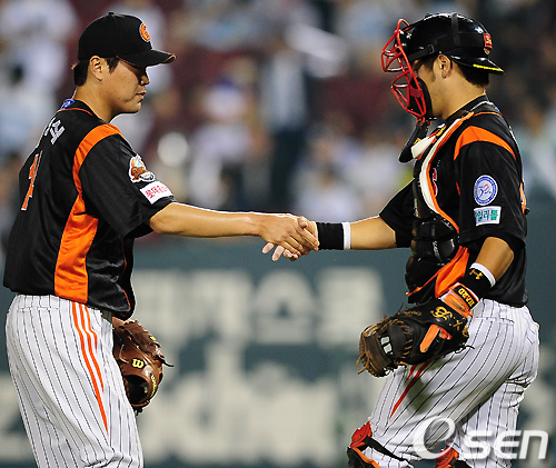 경기를 마치고 롯데 강영식과 강민호가 악수를 나누고 있다./ rumi@osen.co.kr