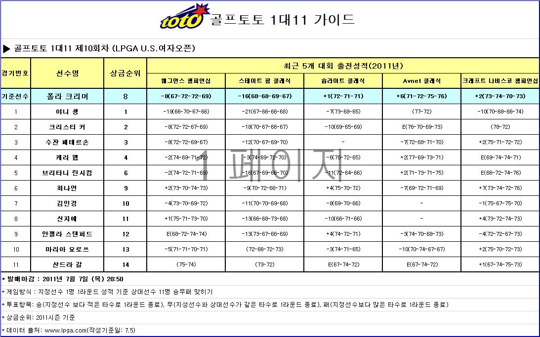 [골프토토] 국내 골프팬들은 골프토토 1대11 10회차에서 현재 LPGA 상금순위 1위 야니 챙이 기준선수 폴라 크리머보다 우수한 성적으로 1라운드를 마칠 것으로 점쳤다.