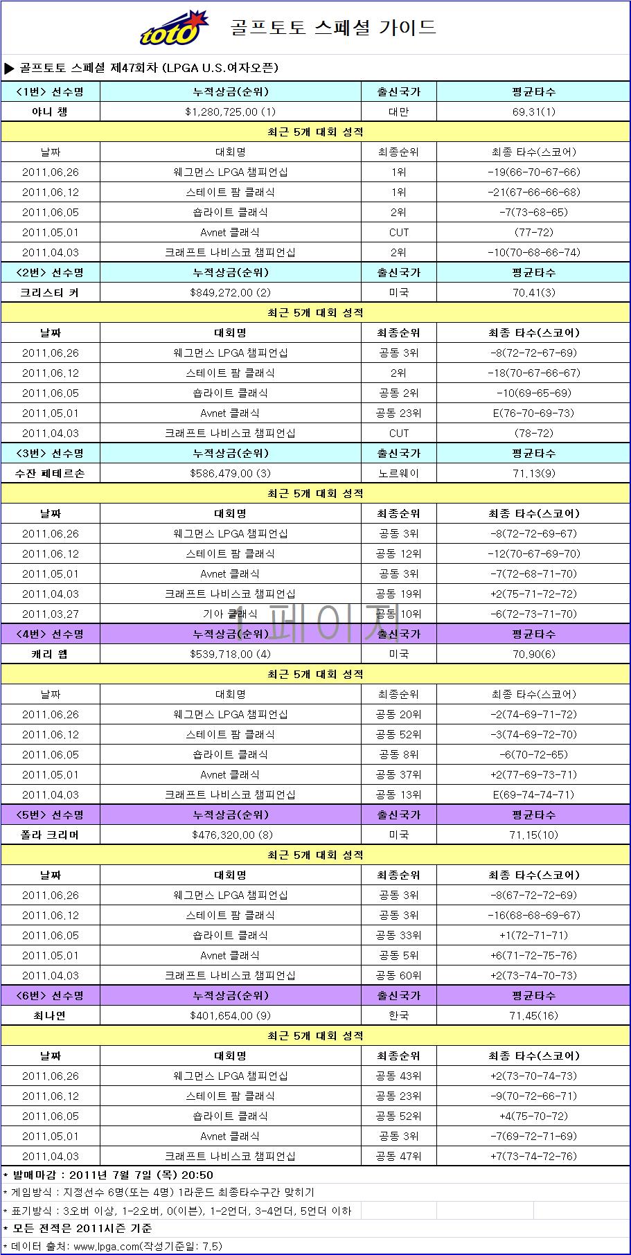 이번 골프토토 스페셜 46회차는 7일 오후 7시 50분, 47회차는 같은 날 오후 8시 50분에 발매가 마감되며, 1라운드가 모두 종료된 후에 결과가 공식 발표된다.