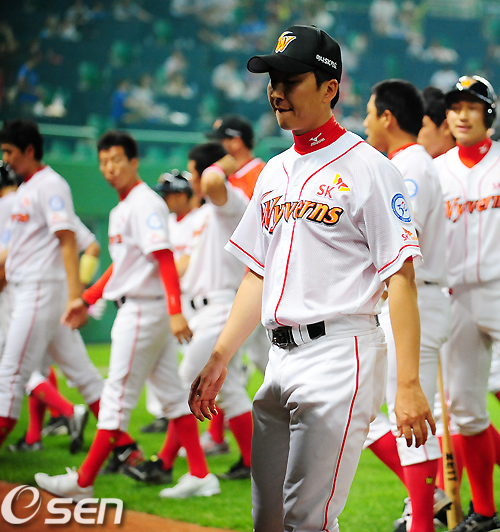 경기를 마치고 7연패를 한 SK 정우람과 선수들이 아쉬워하며 덕아웃으로 들어오고 있다./ rumi@osen.co.kr