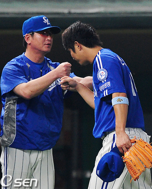 경기를 마치고 삼성 류중일 감독이 신명철과 하이파이브를 하고 있다./ rumi@osen.co.kr