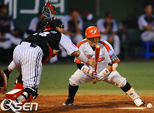7일 오후 대전 한밭구장에서 열린 '2011 롯데카드 프로야구' 한화 이글스와 LG 트윈스의 경기 2회말 2사 2루 한화 이희근의 타석때 LG 조인성 포수가 글러브에 맞고 놓친 공을 줍고 있다. 마치 조인성이 이희근의 배트를 잡는듯한 장면이 연출됐다. / soul1014@osen.co.kr
