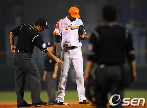 9회초 마운드에 오른 한화 새 용병 바티스타가 김정국 3루심의 지시를 따르고 있다. / soul1014@osen.co.kr