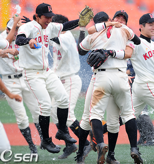 경기를 마치고 고려대 선수들이 마운드 근처에 모여 기쁨을 나누고 있다./ rumi@osen.co.kr