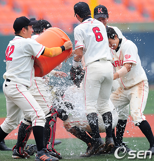 경기를 마치고 고려대 황정립이 물과 얼음 축하 세례를 받고 있다./ rumi@osen.co.kr
