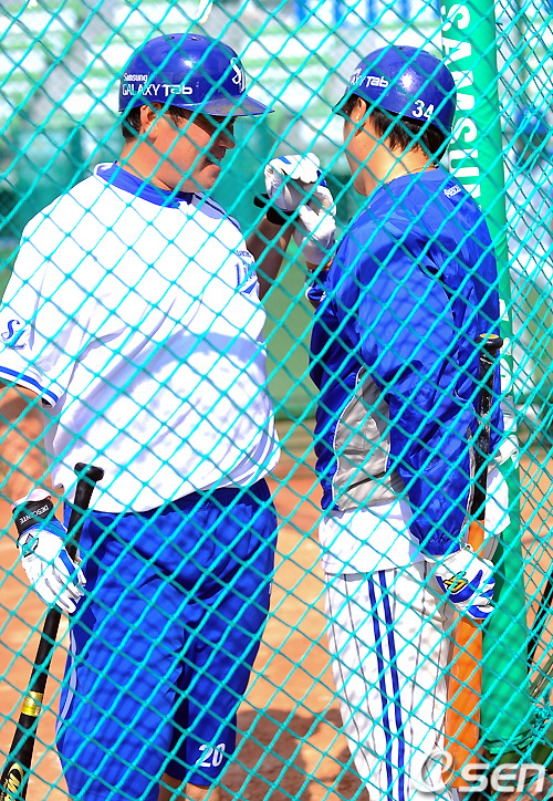 8일 오후 대구구장에서 열리는 '2011 롯데카드 프로야구' 삼성 라이온즈와 두산 베어스의 경기전 삼성 진갑용이 최형우에게 '더위에는 긴 트레이닝 입고 운동하는게 좋다'고 말했다. 이에 최형우가 긴 트레이닝 복을 입고 타격연습에 나서고 있다.  / soul1014@osen.co.kr