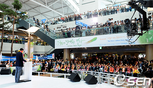 조양호 유치위원장이 환영 인파에 둘러싸여 인사말을 전하고 있다./jpnews@osen.co.kr