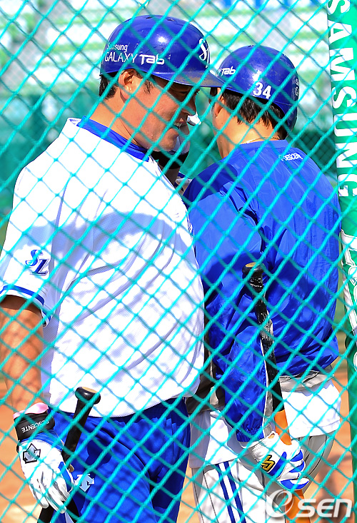 8일 오후 대구구장에서 열리는 '2011 롯데카드 프로야구' 삼성 라이온즈와 두산 베어스의 경기전 삼성 진갑용이 최형우에게 '더위에는 긴 트레이닝 입고 운동하는게 좋다'고 말했다. 이에 최형우가 긴 트레이닝 복을 입고 타격연습에 나서고 있다. / soul1014@osen.co.kr
