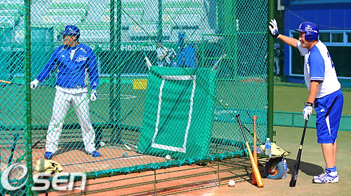 8일 오후 대구구장에서 열리는 '2011 롯데카드 프로야구' 삼성 라이온즈와 두산 베어스의 경기전 삼성 진갑용이 최형우에게 '더위에는 긴 트레이닝 입고 운동하는게 좋다'고 말했다. 이에 최형우가 긴 트레이닝 복을 입고 타격연습에 나서고 있다.  / soul1014@osen.co.kr