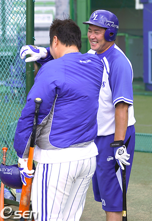 8일 오후 대구구장에서 열리는 '2011 롯데카드 프로야구' 삼성 라이온즈와 두산 베어스의 경기전 삼성 진갑용이 최형우에게 '더위에는 긴 트레이닝 입고 운동하는게 좋다'고 말했다. 최형우가 긴 트레이닝복을 입고 타격을 하자, 진갑용이 미소를 지으며 바라보고 있다. / soul1014@osen.co.kr