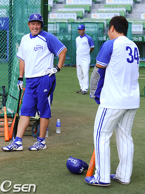 8일 오후 대구구장에서 열리는 '2011 롯데카드 프로야구' 삼성 라이온즈와 두산 베어스의 경기전 삼성 진갑용이 최형우에게 '더위에는 긴 트레이닝 입고 운동하는게 좋다'고 말했다. 긴팔 트레이닝복을 입고 타격연습을 끝낸 최형우가 진갑용과 이야기를 나누고 있다. / soul1014@osen.co.kr