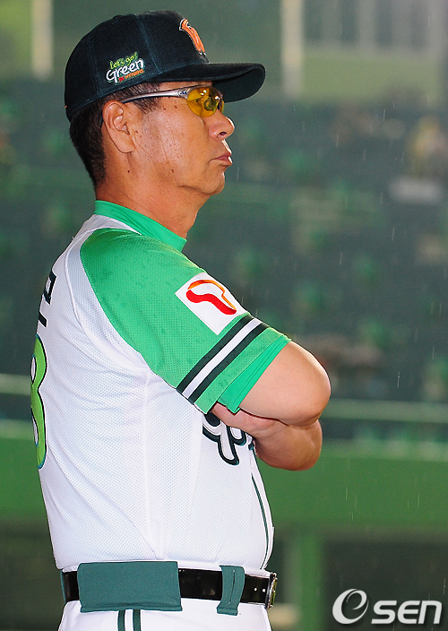경기를 마치고 SK 김성근 감독이 내리는 비를 바라보며 그라운드를 바라보고 있다./ rumi@osen.co.kr