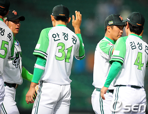 경기를 마치고 SK 정근우와 최정이 동료들과 하이파이브를 하고 있다./ rumi@osen.co.kr