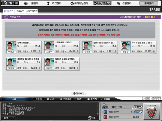 프로리그에서 시즌이 끝나면 이적시장이 열린다. 이와 마찬가지로 'FC매니저'에서도 선수를 영입하는데 신인 드래프트와 입단테스트, 그리고 아이템(선수카드)구입을 통해 선수를 영입할 수 있다. 새로운 선수를 발굴하고 싶다면 트레이드센터로 가보자. 입단테스트는 매일 3회 선수들이 갱신되며 가격대비 우수한 선수들을 영입할 수 있는 좋은 기회로 활용할 수 있을 것이다.