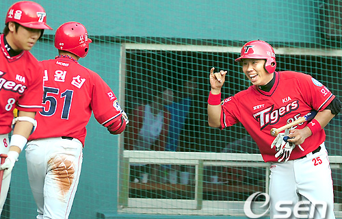 3회초 1사 1루 김원섭이 투런 홈런을 치고 홈에서 이범호의 환영을 받고 있다. /spjj@osen.co.kr