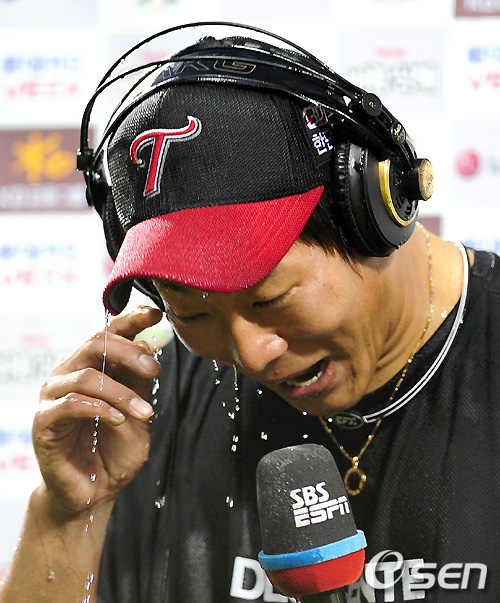 승리투수가 된 박현준이 히어로 인터뷰를 하다 정성훈에게 물벼락을 맞고 활짝 웃고 있다. /spjj@osen.co.kr