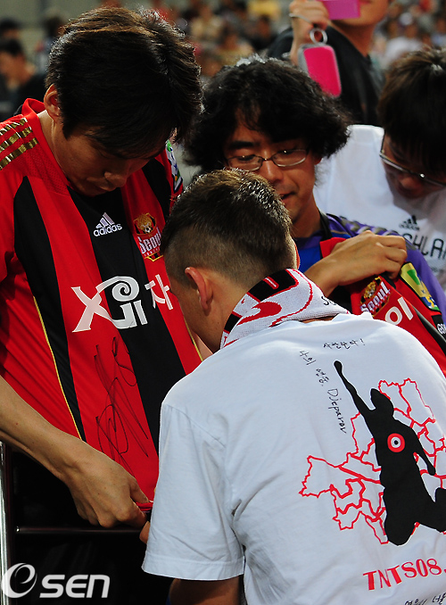 하프타임에 알 샤밥으로 이적이 결정된 제파로프의 환송식이 열렸다. 환송회를 마치고 제파로프가 팬들 유니폼에 사인을 해주고 있다./ rumi@osen.co.kr