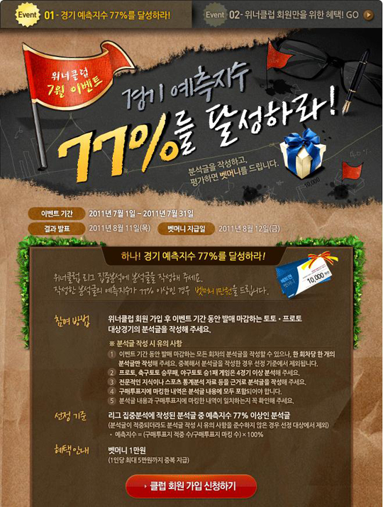한편 이번 '경기 예측지수 77%를 달성하라' 이벤트는 오는 31일까지 참여할 수 있으며 오는 8월 11일에 스포츠토토 및 베트맨 홈페이지를 통해 당첨자를 발표한다.