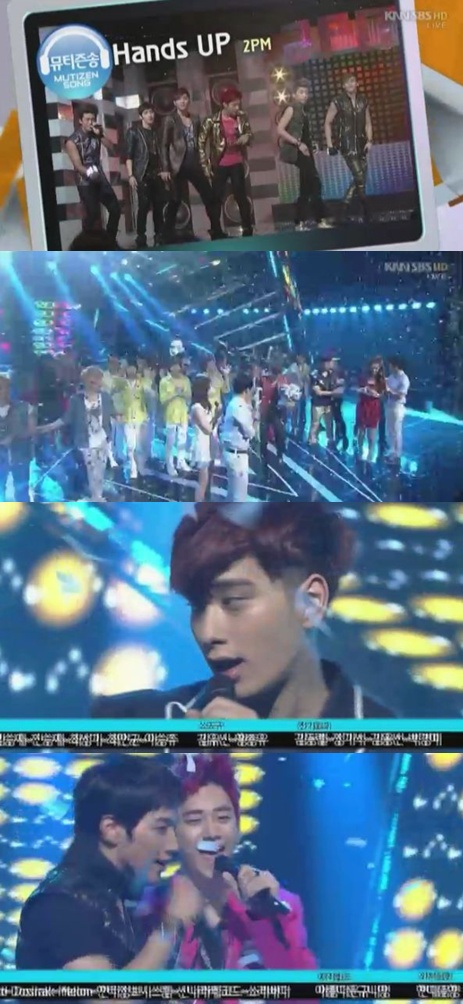 2PM은 10일 오후 방송된 SBS 가요 프로그램 'SBS 인기가요'에서 신곡 '핸즈 업(Hands Up)'으로 1위에 해당하는 ‘뮤티즌송’을 수상했다.