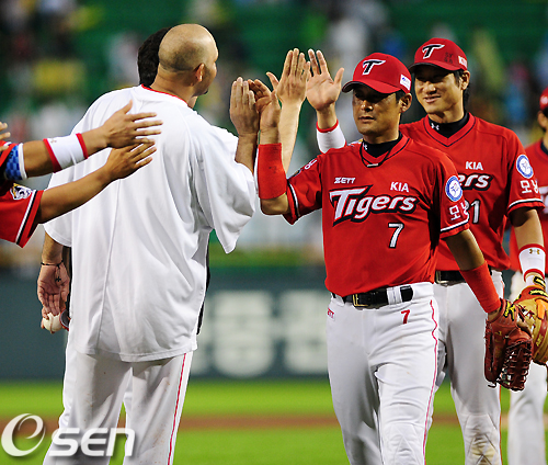 경기후 KIA 로페즈와 이종범이 하이파이브를 하고 있다. /jpnews@osen.co.kr