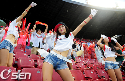 7회말 2사 1루에서 LG 조인성이 투런포를 날리자 치어리더들이 열띤 응원을 선보이고 있다. /jpnews@osen.co.kr