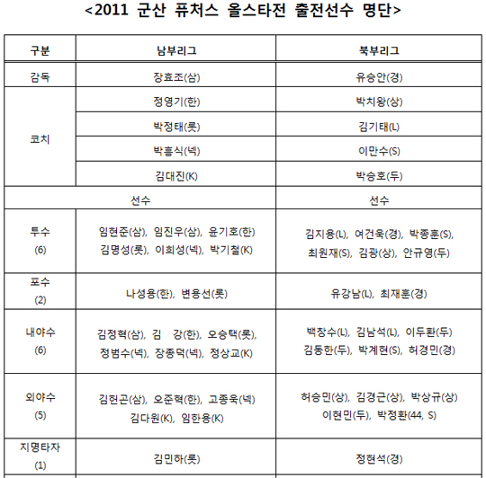 오는 16일 오후 6시 군산 월명구장에서 펼쳐지는 2011 프로야구 퓨처스(2군) 올스타전에 출전할 각 리그 20명의 선수명단이 확정됐다.