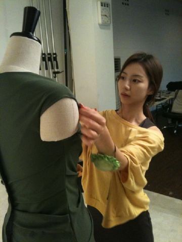 사진 속 박수진은 의상을 날카로운 눈빛으로 바라보고 있으며 그 모습이 마치 프로 디자이너 같은 모습이다.