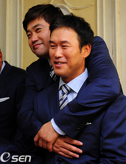 단체 포토타임중 양준혁이 장종훈의 뒤에서 백허그를 하고 있다./rumi@osen.co.kr