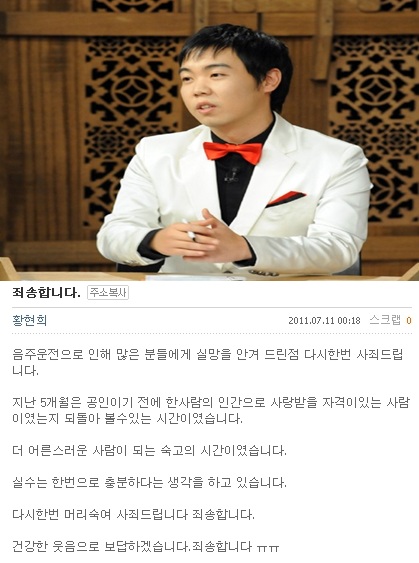 황현희는 11일 자정께 자신의 미니홈피를 통해 "음주운전 때문에 많은 분께 실망을 안겨 드린 점 다시 한번 사죄드린다"라고 운을 뗐다.
