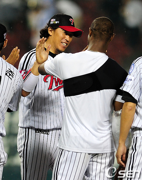 경기후 LG 이병규가 리즈의 7승을 축하하고 있다. / sunday@osen.co.kr