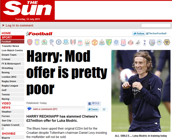 그러나 2700만 파운드의 가격을 접한 토튼햄측은 더욱 불쾌하다는 입장이다. 특히 레드냅 감독이 그렇다. 그는 "No다. 이번 제시안도 지난 번과 같다. 우리는 모드리치를 이적시키지 않길 바란다"며 "2700만 파운드는 모드리치를 영입하기 위해 제안한 것 치고는 매우 형편없는 금액이다"고 불만을 토로했다.