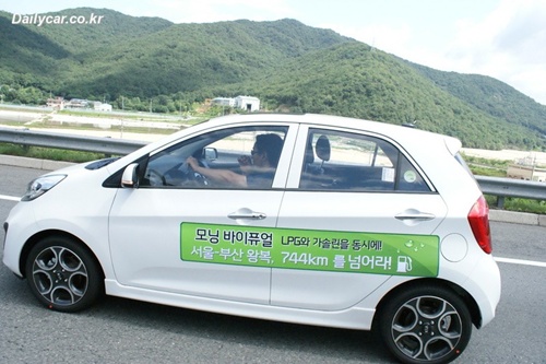 시승차는 모닝 바이퓨얼 럭셔리 모델. 4단 자동변속기가 탑재된 모닝 바이퓨얼은 신형 1.0 카파 엔진을 적용, 최고출력 82마력에 최대토크는 9.6kg.m를 발휘한다.