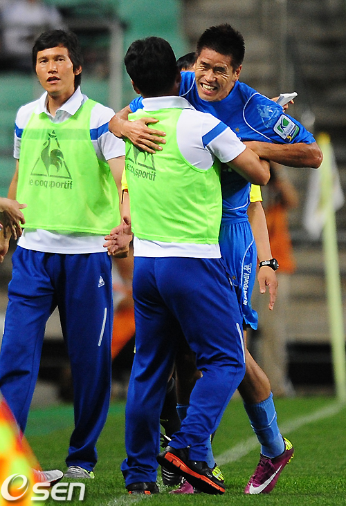 전반 울산 설기현이 2대0으로 앞서가는 골을 성공시키고 코칭스태프와 기뻐하고 있다./ jpnews@osen.co.kr
