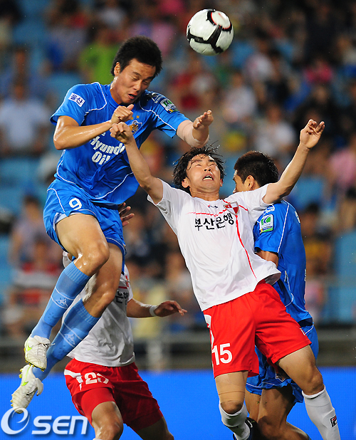 후반 울산 김신욱이 부산 추성호에 앞서 헤딩슛을 시도하고 있다./ jpnews@osen.co.kr