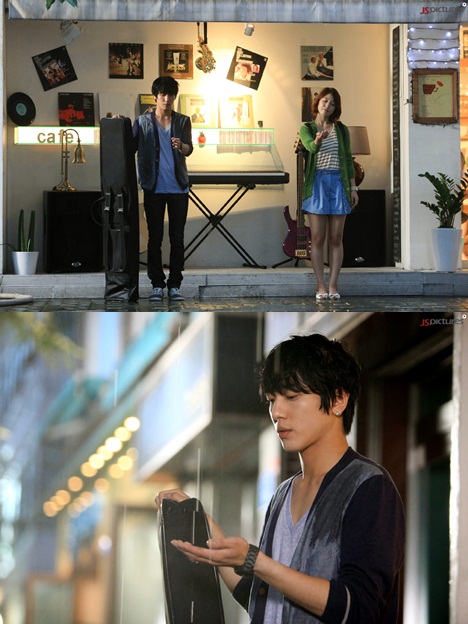 14일 공개된 ‘넌 내게 반했어’의 촬영 현장 사진에는 소나기를 피해 레코드점 처마 밑에 나란히 서있는 정용화와 박신혜가 있다. 정용화는 내리는 비에 손을 내민 모습이며 박신혜는 수줍게 미소 짓고 있다.