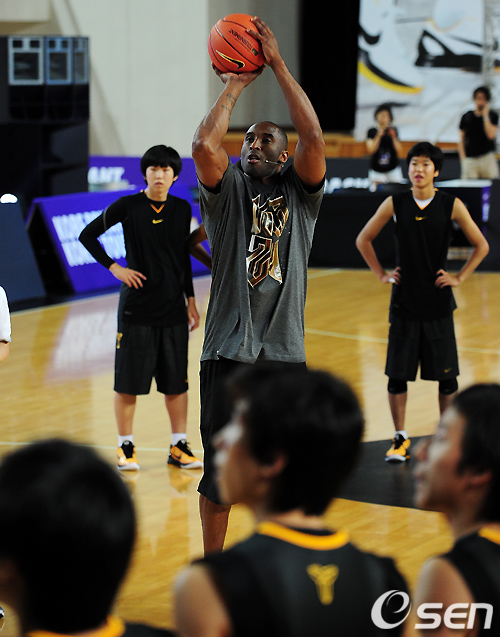 현역 최고의 농구선수라 불리는 ‘블랙맘바’ 코비 브라이언트(33, LA 레이커스)가 나이키 초청으로 14일 오후 고려대 화정체육관에서 학생선수들을 상대로 농구 클리닉과 일대일 매치게임을 가졌다.