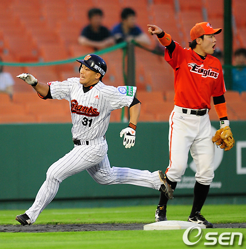 14일 오후 부산 사직구장에서 열린 '2011 롯데카드 프로야구' 롯데 자이언츠와 한화 이글스의 경기, 3회말 2사 1루에서 롯데 손아섭이 선제 1타점 우중간 3루타를 날리고 내친김에 홈까지 전력질주하고 있다. 하지만 손아섭은 한화 이희근에 태그아웃. /jpnews@osen.co.kr